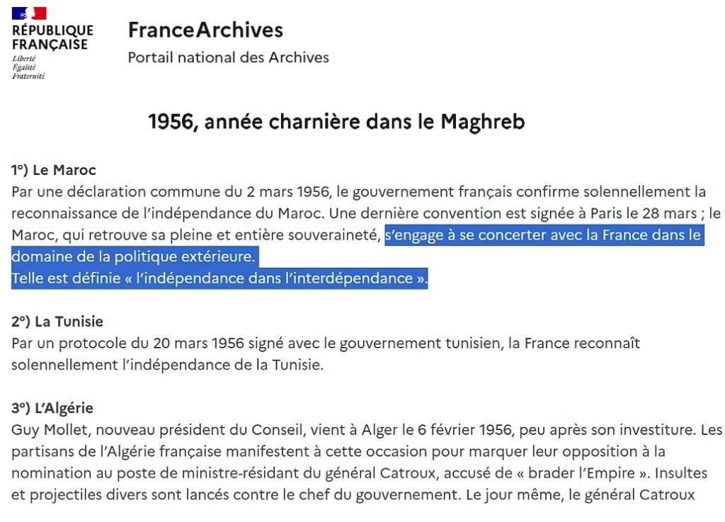 بعد فترة الحماية الفرنسية، تم تنظيم مفاوضات بين المغرب وفرنسا. انضم المغرب إلى الأمم المتحدة بطلب ودعم من فرنسا. الاستقلال الذي حصل عليه المغرب كان استقلالًا ترابطيًا متحدًا مع فرنسا، وليس استقلالًا تامًا.