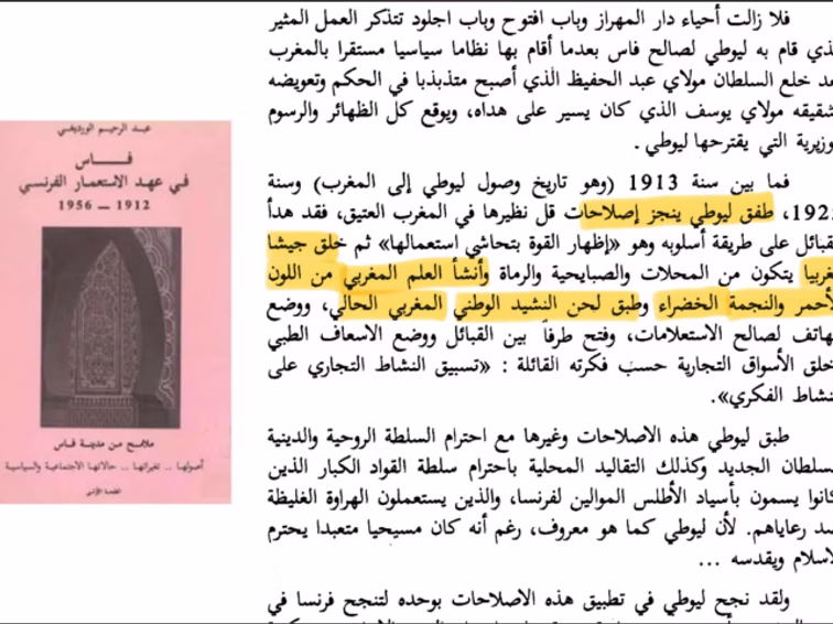 ورد أن الليوطي هو من اسس الجيش المروكي وأنشأ العلم الأحمر بالنجمة الخضراء والنشيد الوطني الحالي.